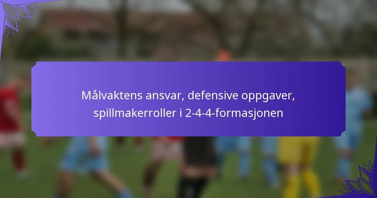I 2-4-4-formasjonen strekker målvaktens rolle seg utover tradisjonell skuddstopp til å omfatte viktige defensive oppgaver og spillmakeransvar. Effektiv posisjonering, kommunikasjon med forsvarsspillere og presis distribusjon er avgjørende for å initiere angrep og opprettholde defensiv stabilitet. Målvakten må tilpasse seg lagets taktiske krav, håndtere høyt press og motpress-scenarier, samtidig som de tar raske beslutninger under press.